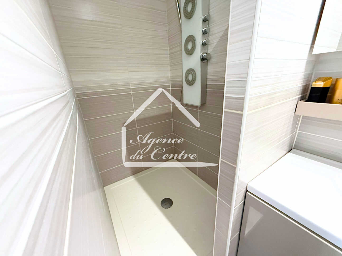 L'espace nuit se compose d'une chambre confortable avec placard intégré, offrant un rangement pratique et discret. La salle d'eau, quant à elle, a été aménagée avec goût : entièrement carrelée, elle dispose d'une grande douche moderne ainsi que de toilettes suspendues, apportant une touche contemporaine supplémentaire.