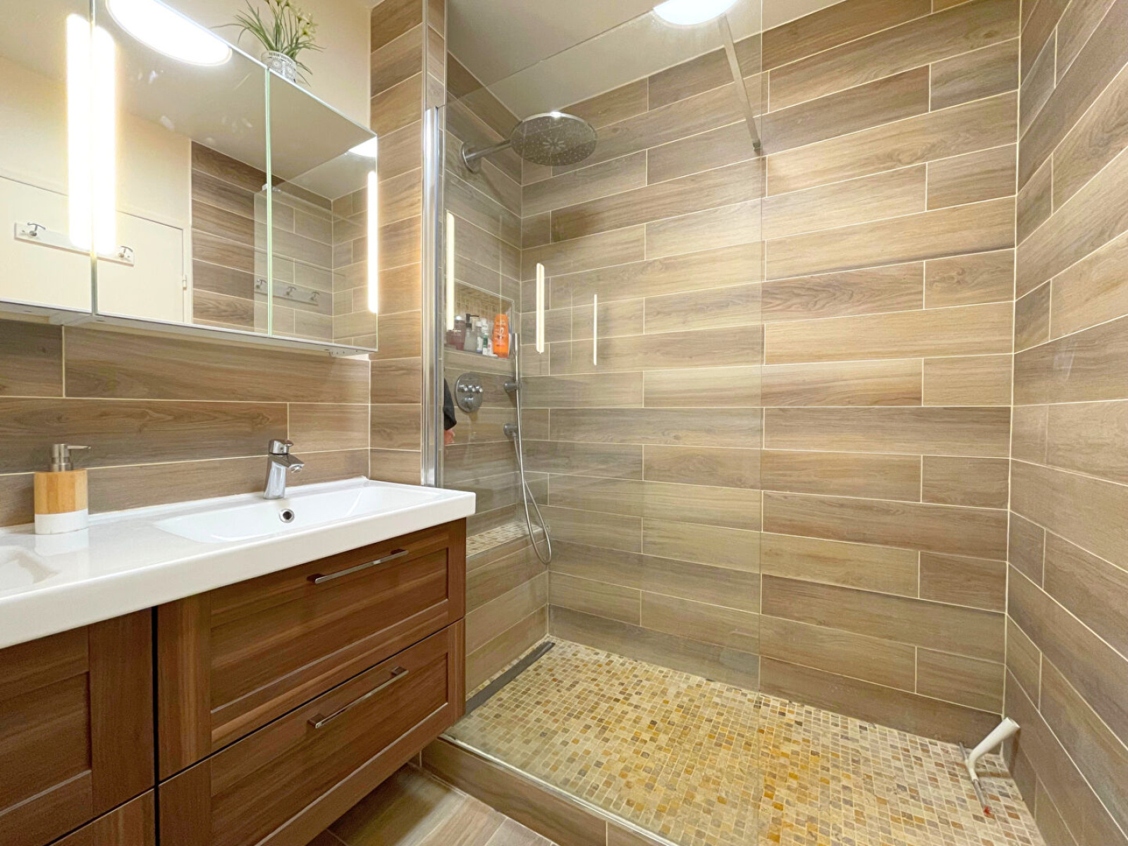 Une salle de douche neuve avec équipements