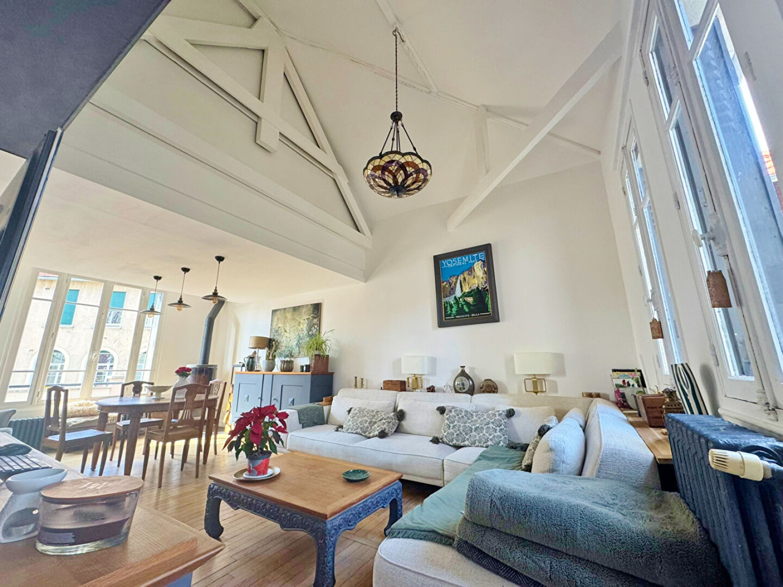 Elle se compose au rez-de-chaussée : d'une entrée avec placard, d'une cuisine équipée, d'une magnifique pièce de vie cathédrale avec séjour et salle à manger traversants, offrant de très beaux volumes et une luminosité remarquable, d'une chambre, d'une salle de bains et de toilettes indépendantes avec lave-mains. Cet espace de vie constitue un véritable coeur de maison, chaleureux et convivial.
