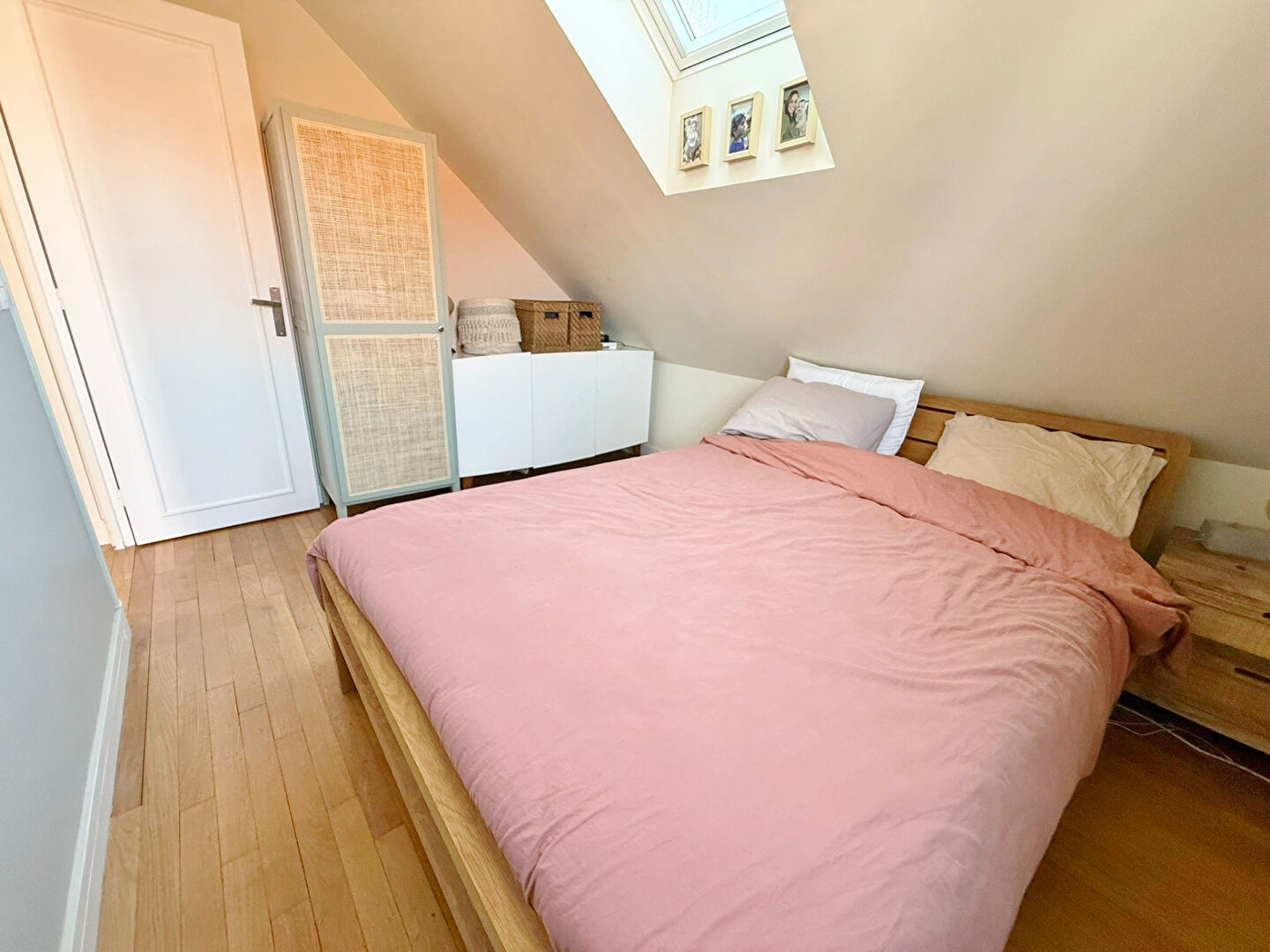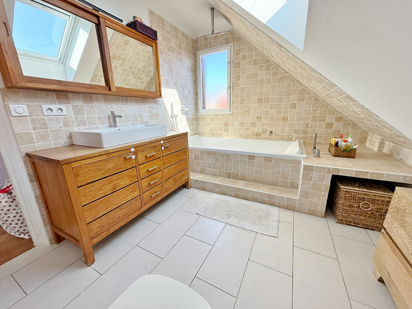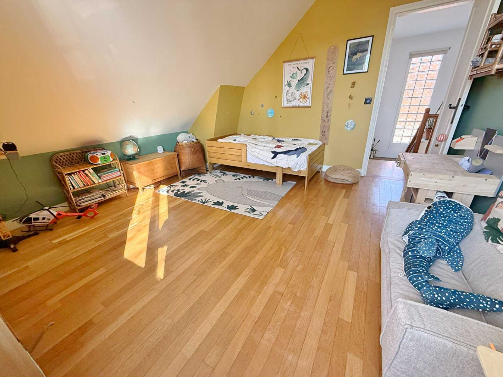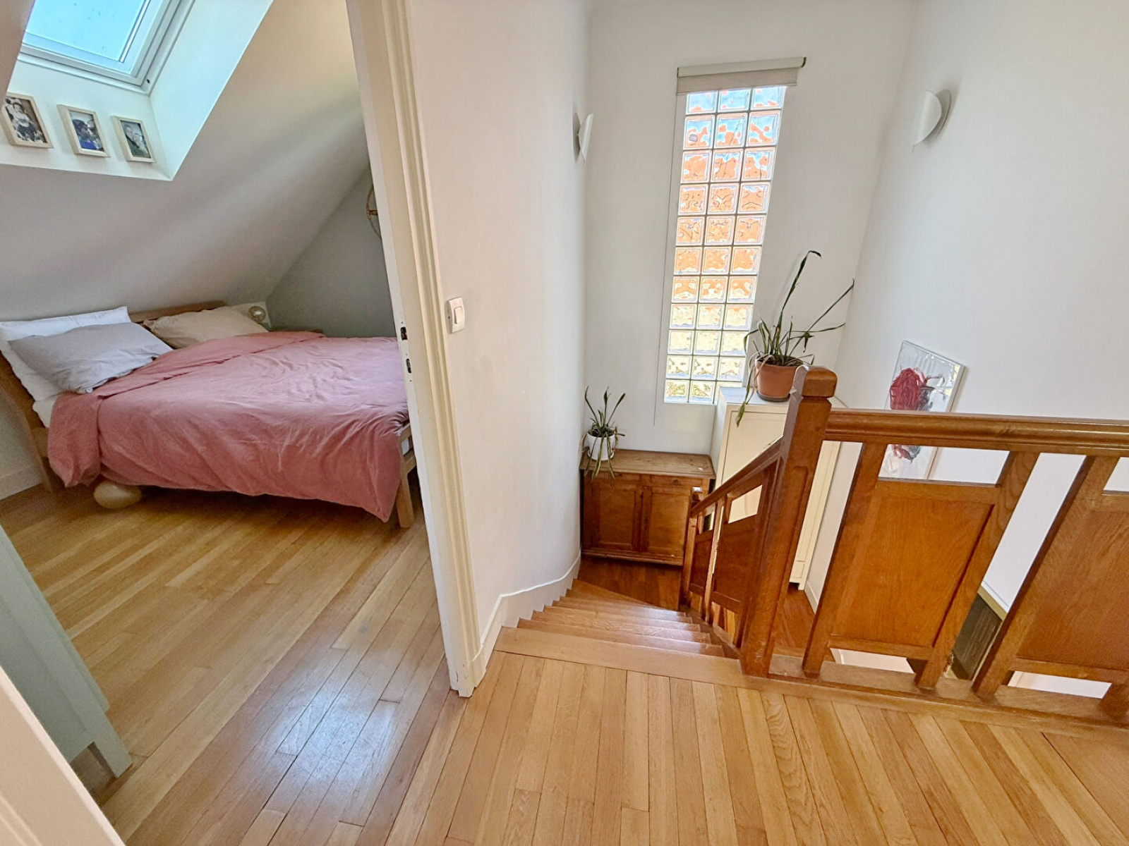 Le rez-de-chaussée dispose également d'une salle de douche et de toilettes. Un élégant escalier quart tournant agrémenté de pavés de verre vous mène à l'étage, où vous trouverez trois chambres confortables réunies sur le même niveau, ainsi qu'une salle de bains avec baignoire et un W.C.